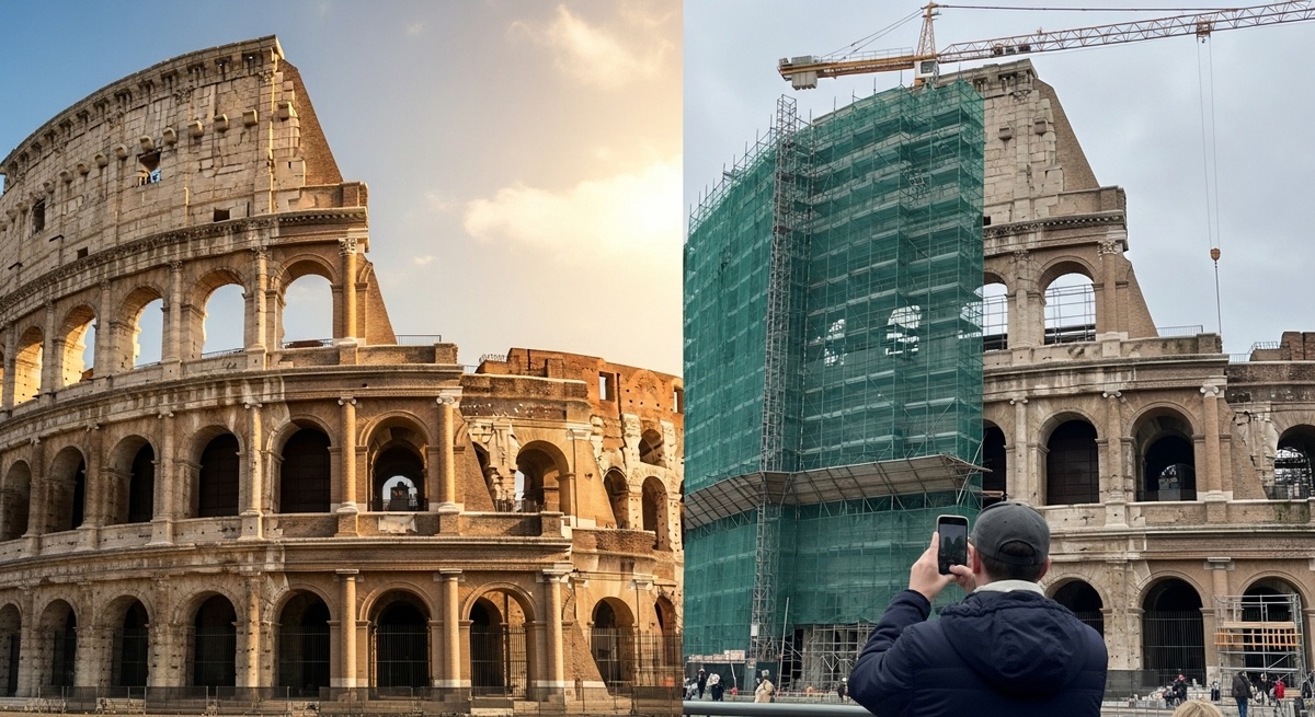 Итальянка: я живу в Риме. Колизей в лесах сколько я себя помню. Это нормальное состояние. Туристы ожидают чистые руины. Мы знаем — леса вечны. Это не баг, это фича.