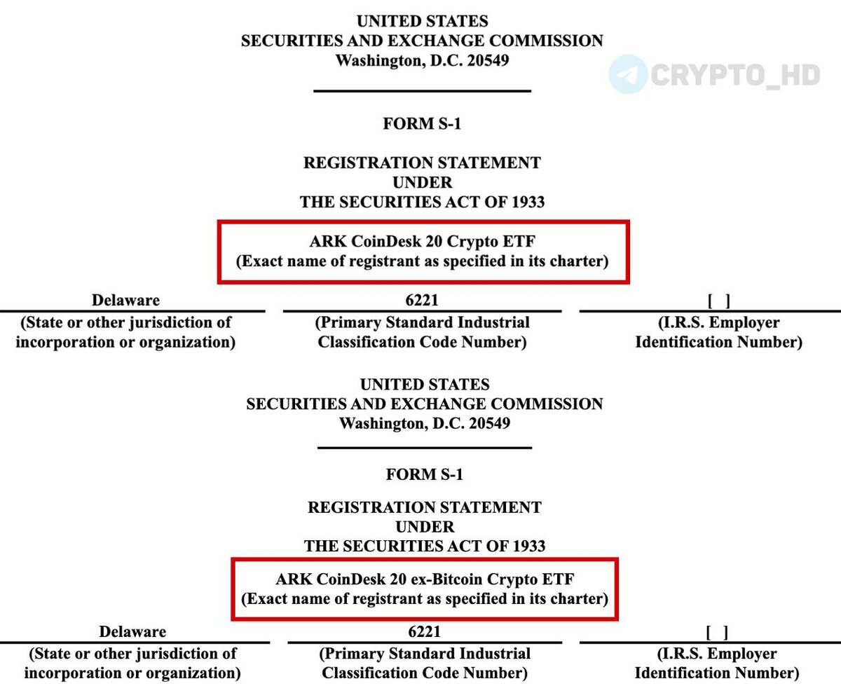 🔥 Компания ARK Invest подала заявки в SEC на запуск CoinDesk 20 Crypto ETF и CoinDesk 20 ex-Bitcoin Crypto ETF