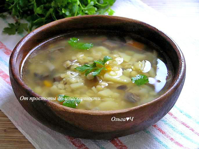 растительное масло для обжарки Приготовление: Картофель нарежьте, залейте горячей водой, доведите до кипения, варите 10 минут. На растительном масле обжарьте нарезанный лук и морковь. Добавьте грибы, готовьте, пока не испарится лишняя жидкость, затем добавьте всё в суп. Затем добавить чечевицу, варите еще 10 минут. Добавьте лавровый лист, посолите, поперчите. Варите до готовности. Приятного аппетита! Вам также могут понравиться: