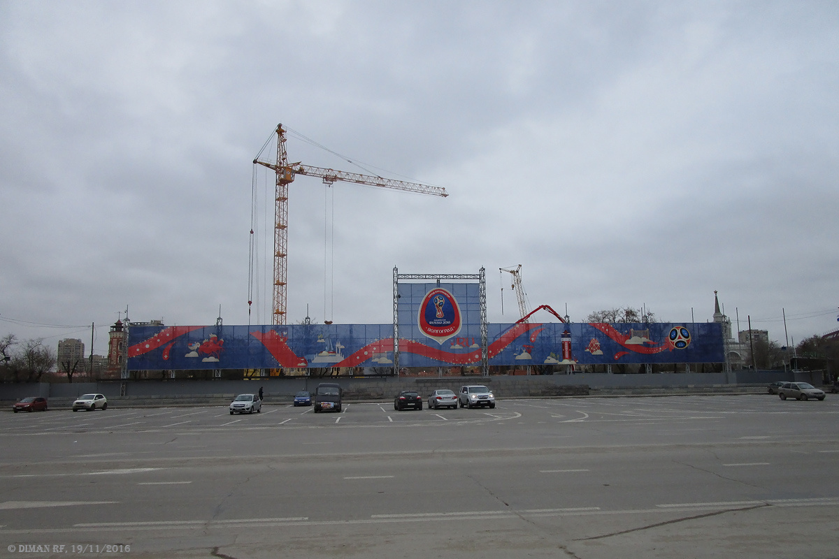 Площадь Павших борцов. Собор Александра Невского только строится. Парковка на площади ещё разрешена. Повсюду в городе появилась символика предстоящего чемпионата мира по футболу-2018.