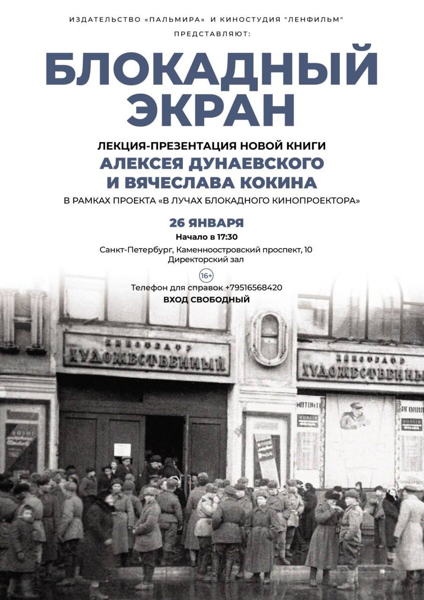 📚Большой друг киностудии, куратор многих наших проектов и сценарист фильма «Блокадный футбол» Алексей Дунаевский, вместе со своим коллегой краеведом Вячеславом Кокиным выпустили в свет книгу о кинотеатрах в блокадном Ленинграде - «Блокадный экран. Кинотеатры, зрители, фильмы». 😀 Презентация книги пройдет 26 января, в 17:30, в директорском зале киностудии «Ленфильм». Эта книга — результат скрупулезного исследования известных петербургских краеведов А. Дунаевского и В. Кокина, посвященного малоизученному явлению жизни блокадного Ленинграда — кинопоказам. Опираясь на обширный корпус архивных источников, авторы убедительно доказывают: кино было не случайным эпизодом на фоне страшной трагедии войны или дополнением к работе театров, но неотъемлемой частью городской повседневности, особой формой духовного сопротивления, памятью и надеждой. Исследование детально восстанавливает картину кинопроката в осажденном городе — организацию показов, репертуар, судьбы кинозалов и зрителей. В книге п
