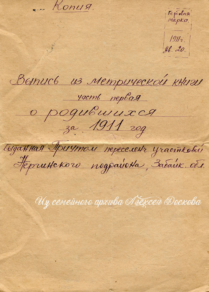 Ниже приведен документ - "выпись из метрической книги", сделанная моим дедушкой - Олимпиевым Николаем Пантелеймоновичем, и официально заверенная.