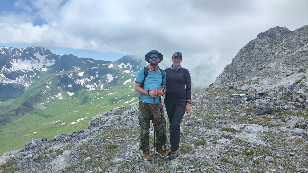 Такие подъёмы я люблю — крут, но недолго. Каких-то 300 м, и мы на вершине. Здесь, несмотря на поднимающуюся с Блыбского перевала и из долины облачность, виды были просто завораживающие. На вершине был установлен триангуляр.