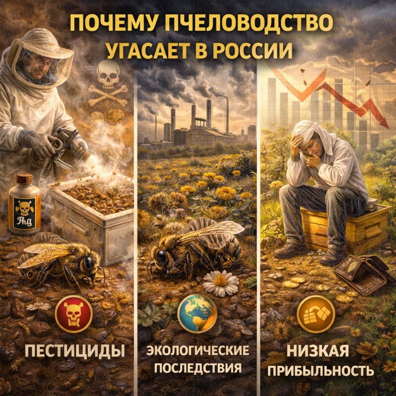 Таким образом, пчеловодство в России угасает из‑за сочетания экологических и экономических факторов. Массовое применение ядохимикатов на полях, отсутствие государственного контроля и поддержки, старение кадров, дорогая сертификация, неблагоприятный климат и распространение паразитов создают условия, при которых содержать пасеку становится трудно и нерентабельно.