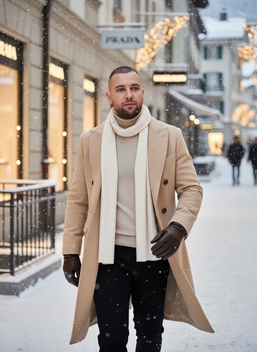 , особенности и естественная привлекательность. Атлетичное телосложение. Натуральная текстура кожи с видимыми порами, естественными бликами, микро-тенями и эффектом подповерхностного рассеяния света. Без сглаживания, без пластикового эффекта, без «AI softness». Изображение должно выглядеть как настоящая профессиональная съёмка для high-end fashion, а не как цифровой арт. Сцена: зимний европейский город с мягко падающим снегом, спокойная кинематографичная атмосфера. Локация: Санкт-Мориц, Швейцария — элегантные светло-бежевые каменные здания, витрины люксовых бутиков Prada и Hanselmann, тёплый золотой декоративный свет, мягко сияющие витринные подсветки. Фон слегка размытый с кинематографичным боке, но архитектурные детали остаются узнаваемыми. Снег — натуральный и реалистичный. Он естественно лежит на земле, крышах и перилах. Вдалеке — слегка размытые силуэты прохожих для реализма. Настроение: утончённая зимняя романтика, современная мужская элегантность, спокойная уверенность и сдерж
