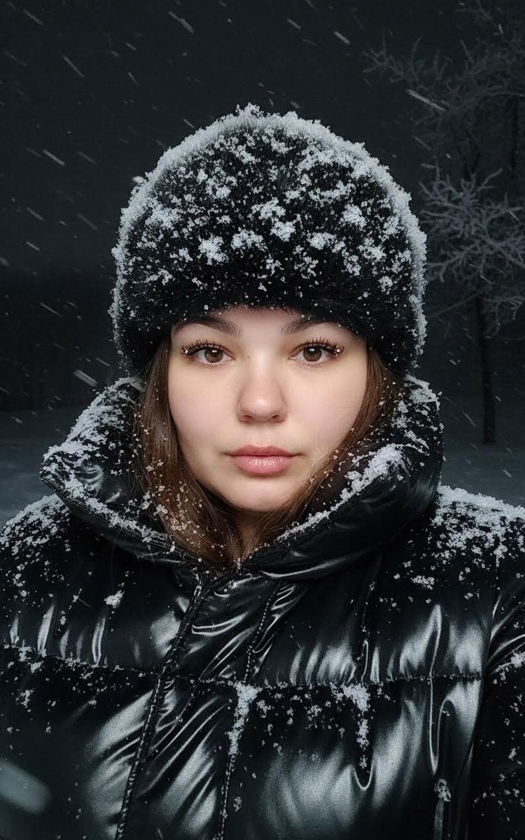 Крупный селфи-портрет, снятый на улице ночью во время сильного снегопада. У женщины видны волосы и выразительные глаза, на ресницах и волосах лежат снежинки. Она в чёрной зимней шапке из искусственного меха, почти полностью покрытой снегом, и в чёрной блестящей пуховой куртке, на которой по воротнику и плечам заметен слой снега. Освещение: мягкий холодный ночной свет сверху и немного спереди, создающий лёгкое свечение на её скулах и деликатные блики на куртке. Поза: она держит камеру чуть ниже уровня глаз, снимая себя под уверенным лёгким верхним углом; губы слегка приоткрыты, выражение спокойное, но интенсивное. Фон: тёмное зимнее ночное небо, едва заметные ветви деревьев с лёгким инеем, минимальная видимость для драматичного настроения. Атмосфера: холодная, кинематографичная, сырая зимняя энергия; стильный современный портрет в снегопад с естественной текстурой и детализацией. #селфи@annapromtii20