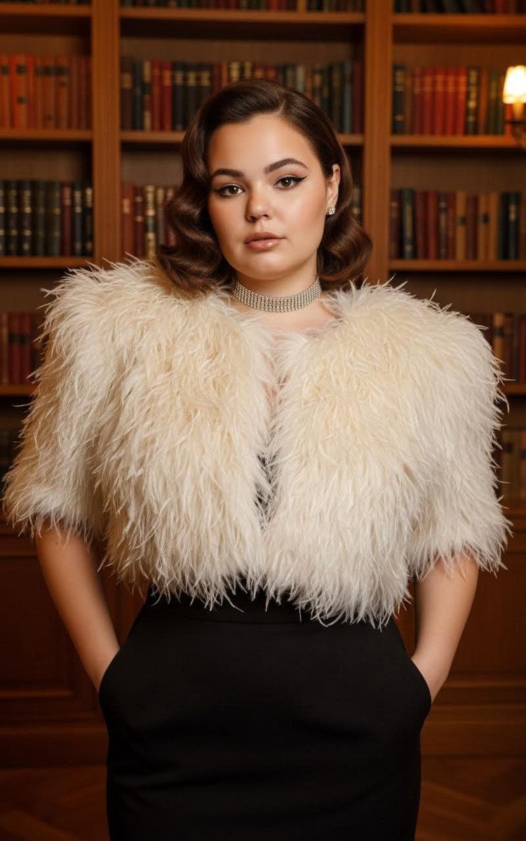 Сохранить лицо, тело, пропорции женщины в точности. Сохранить цвет волос и длину. Создай фото — элегантный вечерний образ в стилистике ретро-гламура. Верхняя часть наряда — короткая, объемная куртка, полностью покрытая перьями кремово‑молочного оттенка с лёгким перламутровым отблеском и выраженными плечами. Куртка открывает зону талии и сочетается с высоко посаженной, приталенной чёрной юбкой или брюками, создавая контраст светлого верха и тёмного низа. Образ дополнен изящным бриллиантовым (или имитирующим бриллианты) ожерельем-чокером и аккуратными серьгами; волосы уложены мягкими волнами в винтажном стиле.Макияж нюд, загорелая кожа, акцент на скуловой зоне, ресницы, стрелки, блеск на губах. Сходство 100%.Поза уверенная — руки в карманах, фон интерьерный с книжными полками, тёплое кинематографическое освещение подчёркивает текстуру перьев и общую роскошь наряда. Это впечатляющий, театральный look для вечернего мероприятия или фотосессии. #женские@annapromtii20