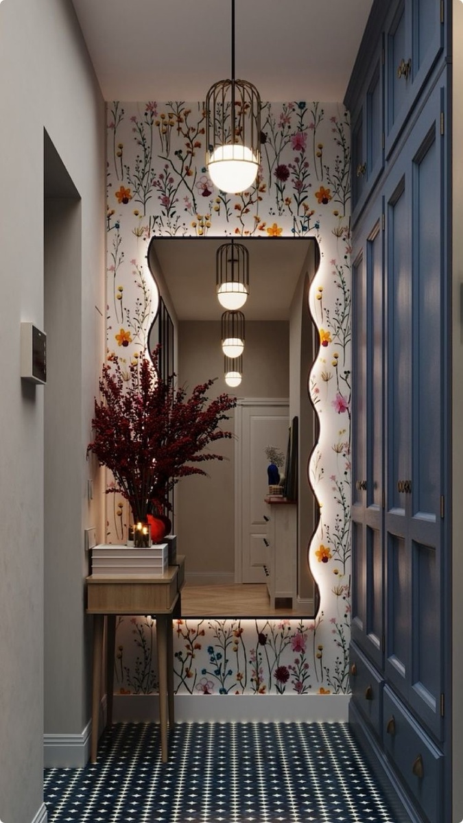 Тут все классном на мой взгляд. Акцентная стена с цветочным принтом и с необычным зеркалом, небольшая тумбочка, которую не получится завалить хламом, но можно что-то положить когда уходишь и приходишь. Большой шкаф в потолок - раздуться/одеться и разуться/обуться. Я бы поставила еще пуф и постелила коврик.