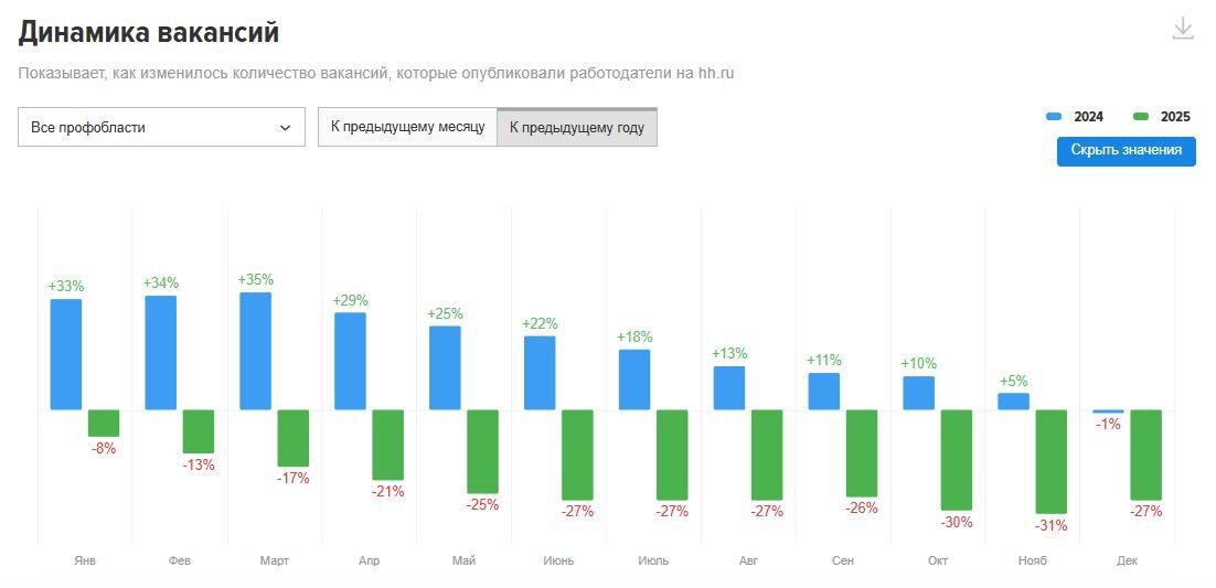 Так выглядит ситуация на рынке труда: количество новых вакансий уменьшается каждый месяц уже два года подряд. Стоит ли переживать, кто виноват и что делать? Давайте разбираться. Почему это происходит? Так выглядит охлаждение экономики: - кредиты дорогие, налоги повышаются, вести бизнес становится дорого; - бизнес ужимается, людей сокращают, цены на товары растут, денег становится меньше; - люди меньше тратят, бизнесам становится еще сложнее, и они еще больше затягивают пояса. К чему это приводит? Тут я опишу вещи, которые вижу сам в IT-сфере: 1. Джунам по-прежнему сложно. Джуниорских вакансий всё меньше, а те, которые есть, трансформируются в стажёрские, что увеличивает стартовый путь человека. 2. Накрутка опыта. Для устройства на работу люди начинают накручивать опыт и пытаться обманом попасть в компанию. Причём не только на свою позицию, но и на позиции выше. Работодателю это не нравится ➡️ отбор становится жёстче ➡️ устроиться ещё сложнее. Эта проблема усугубляется засильем ИИ и инс