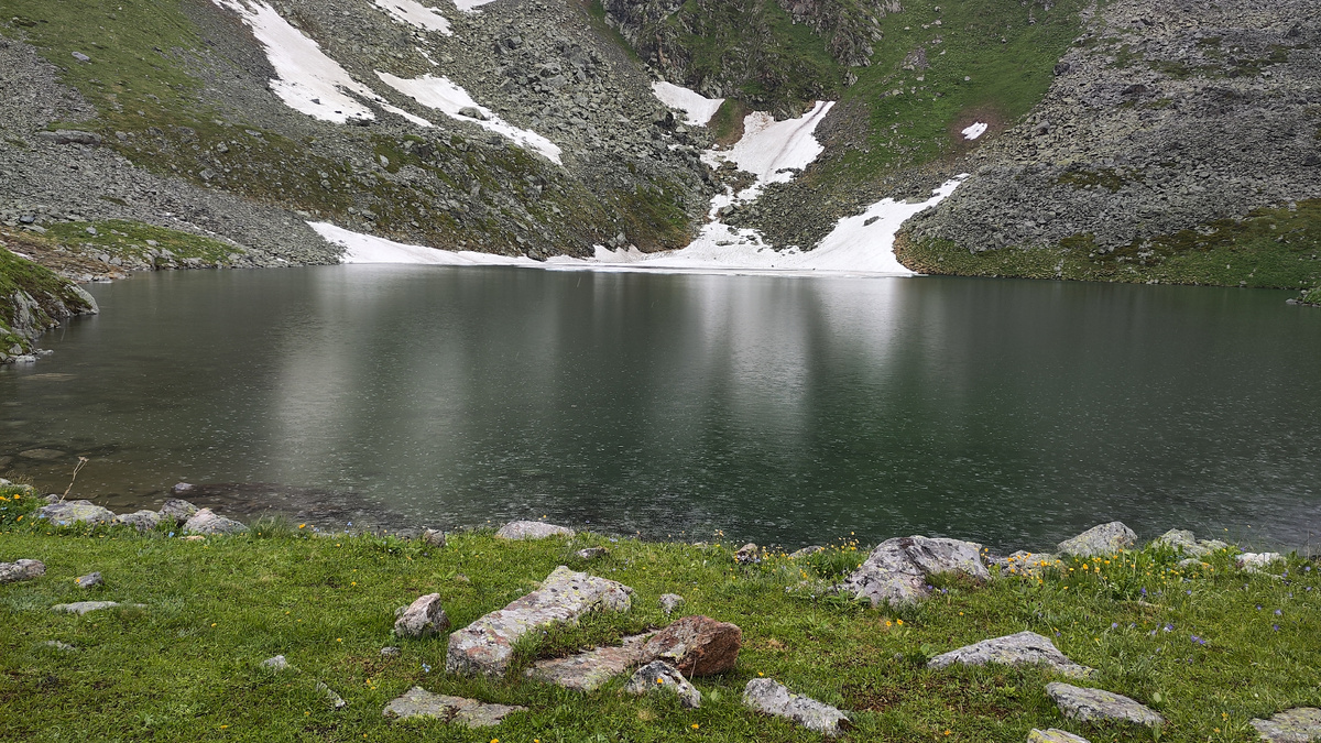 Позавтракали, собрали мокрую, сильно потяжелевшую палатку, надели дождевики и отправились в путь. Сегодня наша цель — дойти до вершины горы Хацавиты. А это целых 20 километров пути. Сначала нужно выбраться от озера до хребта Магишо. Казалось бы, глядя на карту, что это прямой путь по верхам хребта вдоль глубокой долины, простиравшейся внизу. Но по факту скотопрогонные тропы и террасы вихляли вверх и вниз, заворачивались за уступы, ныряли в овраги и расщелины. И временами казалось, что мы сбились.