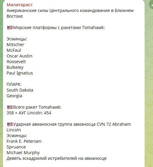 «Мы внимательно следим за Ираном. У нас много кораблей на пути к Ирану, есть авианосец на пути туда. Посмотрим, что произойдет. У нас большая сила на пути туда, я не хочу, чтобы что-то случилось, но нам придется посмотреть, что произойдет», - президент Трамп Милитарист пишет, что с вероятностью около 30% через несколько часов ожидаются удары США и Израиля по Ирану, время привязано к закрытию валютного рынка на выходные и североамериканских рынков на день.