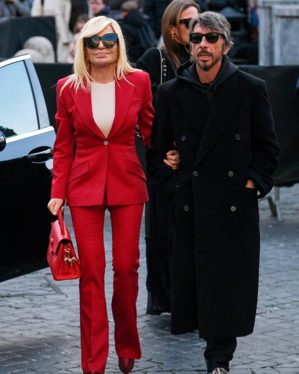 Донателла Версаче слишком буквально восприняла цитату покойного Валентино Гаравани «Меня не очаровывают люди, одетые во всё чёрное» и решила попрощаться с маэстро в его фирменном красном.