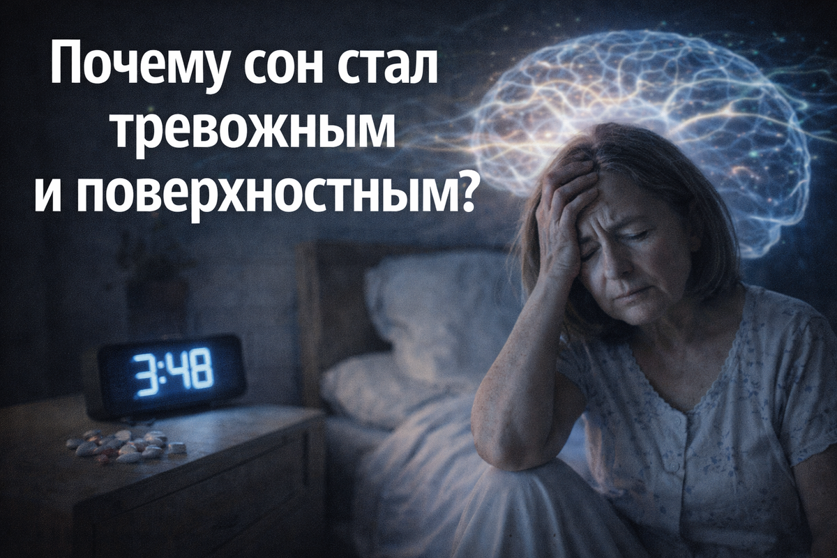 Кажется, спишь — а как будто не спал. Вроде и глаз не сомкнул, а уже утро. В голове — тысячи мыслей, тело не расслабляется, а утром тревожность, усталость и раздражительность. Многим знакома ситуация: засыпаешь нормально, но спишь «на поверхности», как будто мозг всё время на страже. Просыпаешься от каждого шороха, сны — беспокойные, и нет чувства отдыха. Почему это происходит? И почему с возрастом — особенно после 40–50 лет — таких ночей всё больше? Разбираемся, что реально говорит наука про поверхностный сон и тревожные пробуждения. Сон делится на фазы: Глубокий сон — ключ к восстановлению. Именно он отвечает за: Если глубокого сна мало, мозг будто «не уходит в оффлайн» — отдых становится фикцией. С возрастом наш сон объективно меняется: Даже если внешне ты спокоен, организм может жить в режиме «бей или беги». Как распознать: Магний участвует в расслаблении мышц и нейроторможении. Его нехватка делает сон тревожным, тело напряжённым, появляются подёргивания и бессознательная тревога.