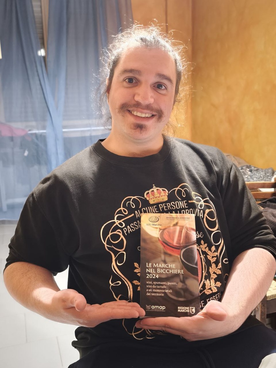 Евген демонстрирует буклет с вином региона Марке,