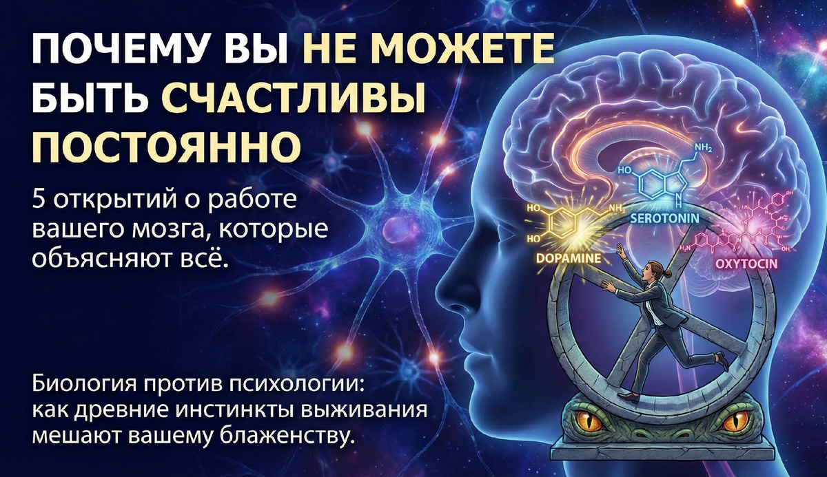 Почему, несмотря на все наши усилия — медитации, книги по самопомощи, стремление к успеху, — постоянное, безмятежное счастье кажется недостижимым? Мы часто виним в этом себя, свою недостаточную силу воли или неправильные цели. Но что, если ответ кроется не в нашей психологии, а в биологии? Что, если наш мозг просто не предназначен для вечного блаженства?