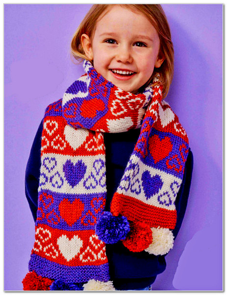 Перевод из журнала "Simply Knitting", № 273, 2026 г. Оживите день ярким сердечным шарфом, полным красных, кремовых и фиолетовых мотивов, завершённым весёлыми помпонами! Вяжется на круговых или чулочных спицах вкруговую. Вам потребуется: пряжа Cascade Pacific (60% акрил, 40% мериносовая шерсть, 100 г/195 м) - по 100 г каждого цвета: пряжа A красно-коричневая (Rooibos Tea 177); пряжа B кремовая (Cream 01); пряжа C фиолетовая (Petunia Heather 190). круговые спицы 4,5 мм и 5 мм, или набор чулочных спиц 4,5 мм и 5 мм.