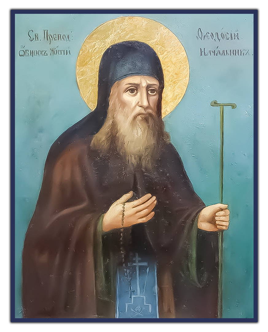 О священная главо, преподобне отче, преблаженне авво Феодо́сие, не забуди убогих твоих до конца, но поминай нас всегда во святых и благоприятных молитвах к Богу: помяни стадо твое, еже сам упасл еси, и не забуди посещати чад твоих моли за ны, отче священный, за дети твоя духовныя, яко имеяй дерзновение к Небесному Царю: не премолчи за ны ко Господу, и не презри нас, верою и любовию чтущих тя: поминай нас недостойных у Престола Вседержителева, и не престай моляся о нас ко Христу Богу, ибо дана тебе бысть благодать за ны молитися. Не мним бо тя суща мертва: аще бо телом и преставился еси от нас, но и по смерти жив сый пребываеши, не отступай от нас духом, сохраняя нас от стрел вражиих и всякия прелести бесовския и козней диавольских, пастырю наш добрый. Аще бо и мощей твоих рака пред очима нашима видима есть всегда, но святая твоя душа со ангельскими воинствы, со безплотными лики, с небесными силами, у престола Вседержителева предстоящи, достойно веселится, ведуще убо тя воистину и по смерти жива суща, тебе припадаем и тебе молимся: молися о нас Всесильному Богу, о пользе душ наших, и испроси нам время на покаяние, да невозбранно прейдем от земли на небо, от мытарств же горьких, бесов воздушных князей и от вечныя муки да избавимся, и Небеснаго Царствия наследницы да будем со всеми праведными, от века угодившими Господу нашему Иисусу Христу: Ему же подобает всякая слава, честь и поклонение, со Безначальным Его Отцем, и с Пресвятым и Благим и Животворящим Его Духом, ныне и присно, и во веки веков. Аминь.