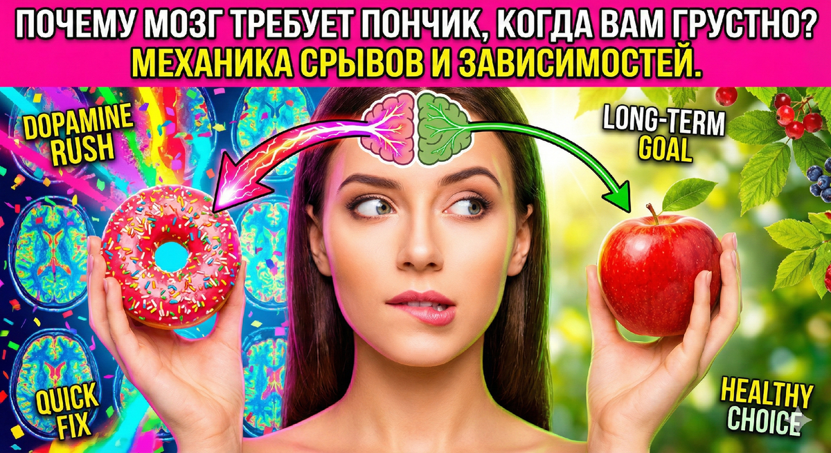 - Мозг отчаянно ищет облегчения. Ваш мозг, отвечающий за выживание, сканирует свою память в поисках гарантированной «победы». Ему не важны долгосрочные последствия — ему нужно облегчение прямо сейчас. Память подсказывает: сладкий пончик однажды уже приносил облегчение.