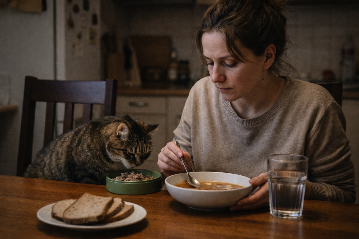 Вот. И кот не помнит, что такое еда. Потому что коты — штука странная: они не только ловят мышей, они ловят атмосферу. Если дома пахнет «всё равно», кот тоже начинает жить в режиме «всё равно».