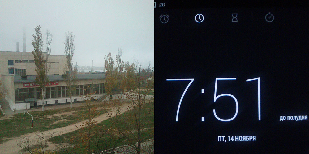 Проснулась, вытащила плечо из-под Славки, аккуратно вылезла из-под одеяла, оделась, сфотографировала время телефоном на планшете, спросонья позабыв, как делать скриншоты)) И утренний вид из окна. Туман, надо же! Повезло.
