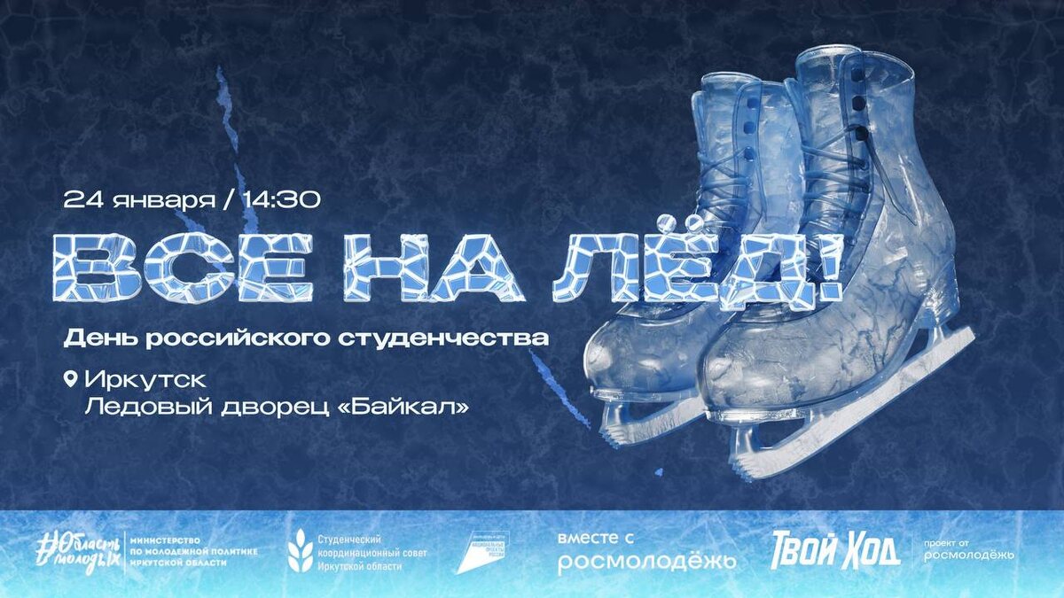 !» В праздничной программе: ▪️катание на коньках ▪️интерактивные зоны ▪️горячий чай ▪️большой ёхор на коньках ▪️выступление кавер-группы ➡️Обязательно зарегистрируйся на сайте: vsenaled.minmol38.ru/ Бери с собой друзей, хорошее настроение, коньки (если нет своих, можно взять напрокат), встречаемся в 14.00 ч. в Ледовом дворце «Байкал» и празднуем День российского студенчества вместе! #Иркутскстуденческий