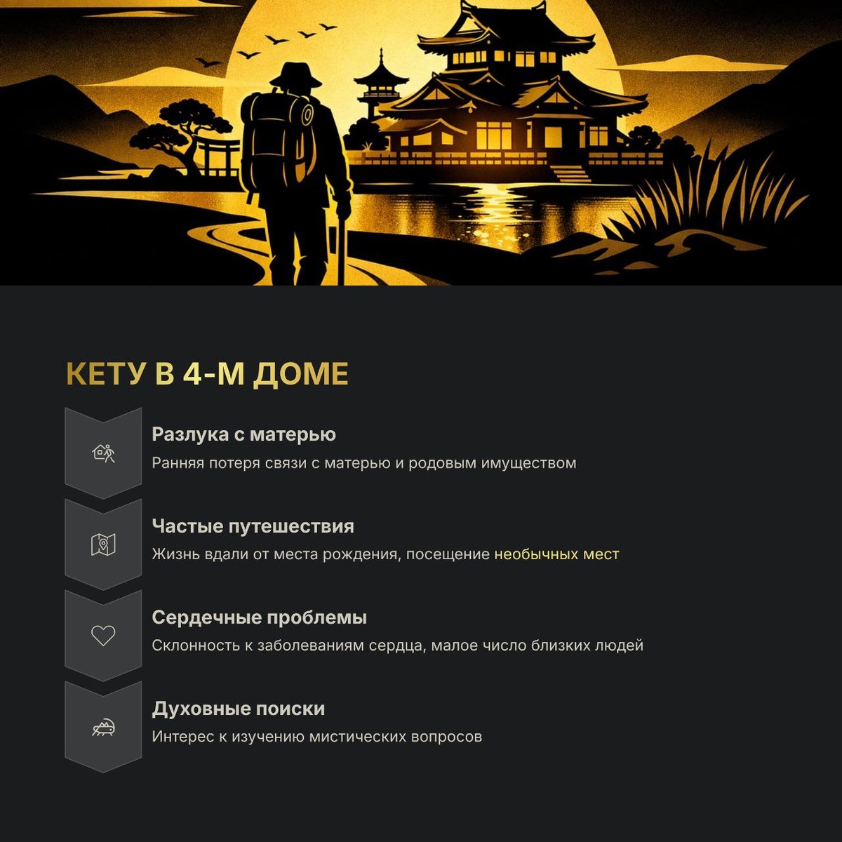 🏚️ Это глубокое кармическое положение, связанное с уроками отречения от материального мира и поиском своего истинного духовного «дома». Оно приносит нестабильность в сфере семьи, корней и эмоциональной безопасности, но открывает путь к высшему познанию. 🔺 Кармические вызовы и потери: 🔸 Разрыв с истоками: Возможна ранняя разлука с матерью или эмоциональная отстраненность в этих отношениях. Часто приходится жить вдали от места рождения. 🔸 Потеря собственности: Может произойти утрата родового имущества, земли или дома, ради которого было приложено много усилий. 🔸 Одиночество и здоровье: Окружение может быть немногочисленным, с малым количеством близких людей. Существует склонность к тревожности и психосоматическим сердечным заболеваниям. 🔸 Духовный путь и судьба: 🔸 Неустанный поиск: Жизнь наполнена частыми переездами и путешествиями в необычные, мистические места. Вы ищете не физический, а духовный дом. 🌌 🔸 Внезапные перемены: Вы подвержены резким, неожиданным изменениям