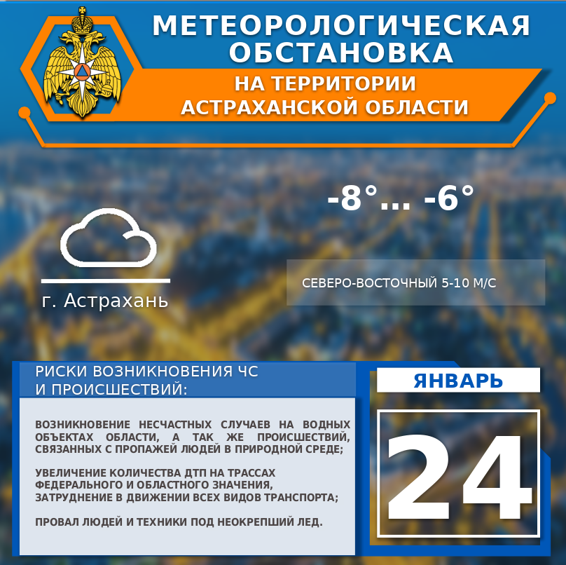 По г. Астрахань облачно. Слабый снег. Ветер северо-восточный 5-10 м/с. Температура воздуха -8…-6°.