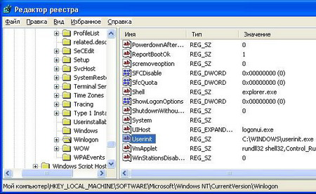 *** Симптомы неисправности: операционная система Windows не загружается – процесс загрузки доходит до Приветствия (или до окна выбора учётной записи). После выбора учётной записи последовательно появляются сообщения «Загрузка личных параметров», «Сохранение параметров…» и опять – окно выбора учётной записи… Как правило, это результат деструктивных действий вируса. Этот вирус в папке \WINDOWS\ создает файл userinit.exe (233 472 байт). Копия вируса – под именем system.exe (233 472 байт) – создается в папке \WINDOWS\system32\. Чтобы лже-userinit подменил настоящий userinit.exe (Приложение Userinit для входа в систему; \WINDOWS\system32\; 25 088 байт), в разделе Реестра [HKEY_LOCAL_MACHINE\SOFTWARE\Microsoft\Windows NT\CurrentVersion\Winlogon] значение строкового (REG_SZ) параметра Userinit (значение по умолчанию C:\Windows\system32 \userinit.exe,) подменяется значением C:\Windows\userinit.exe: Вследствие этого вирус постоянно находится в опе