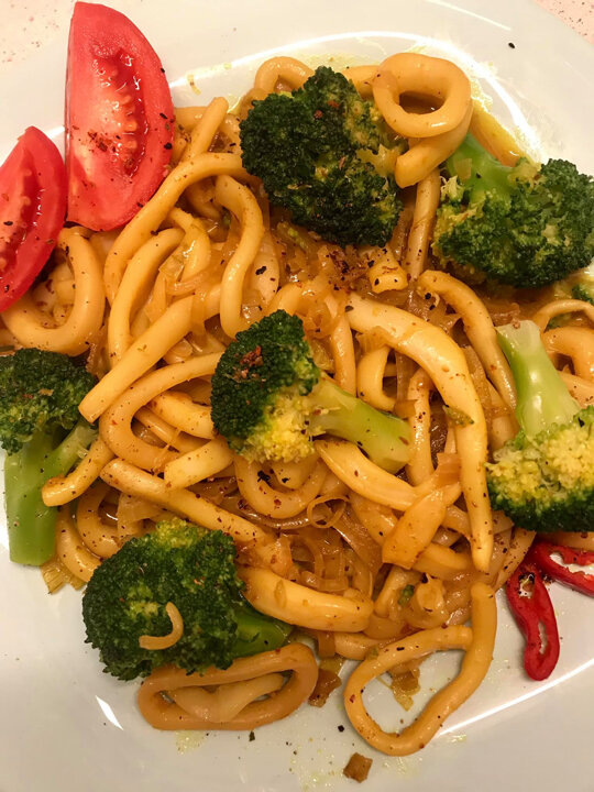 На 2 порции: ✔ Кальмары очищенные (тушки) — 300-350 г; ✔ Брокколи свежая — 200 г; ✔ Лук — 1 шт.; ✔ Масло гхи (топлёное) — 1 ст. л.; ✔ Соевый соус (без сахара, например, тамари) — 2 ст. л.; ✔ Сок лимона — 1 ст. л. (15 мл); ✔ Специи: куркума, смесь перцев — по вкусу (~2-3 г). Кальмаров моем, очищаем от плёнок, режем кольцами (полукольцами). На масле (у меня масло Гхи - топленое сливочное масло) слегка обжариваем одну луковицу, нарезанную полукольцами. Из приправ я добавила куркуму, соевый соус (без сахара) и смесь перцев. Нарезанных кальмаров отправила к луку примерно на 5 минут, чуть добавив огонь, и при интенсивном помешивании довела до испарения жидкости. Выключив плиту, добавила к кальмарам брокколи, предварительно отваренную в течение 2 минут. Все перемешав, подала к столу, полив выжатым из кусочка лимона соком. КБЖУ на 100 г – 75/10,2/2,4/4,0 (из них ~40% - клетчатка). Рецепт на странице Безразличие, боль, отсутствие желания — эти проблемы принято прятать, считая их личным провалом
