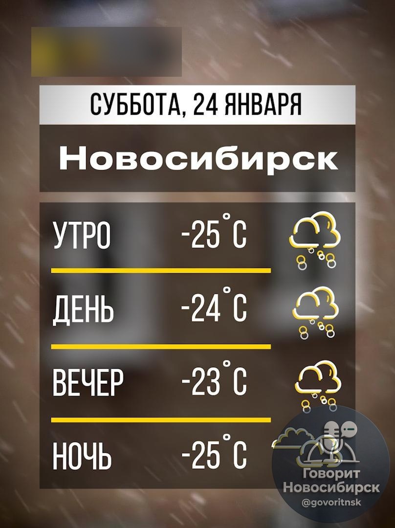 Сегодня, в субботу, весь день ожидаются осадки в виде снега. Дневная температура воздуха составит около -24°C ❄️