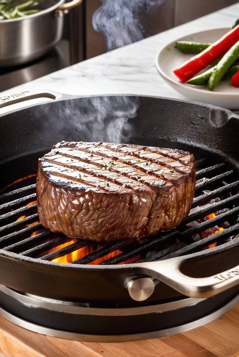 - Стейк: Горячий стейк-пресс создает идеальную корочку и полоски на мясе.