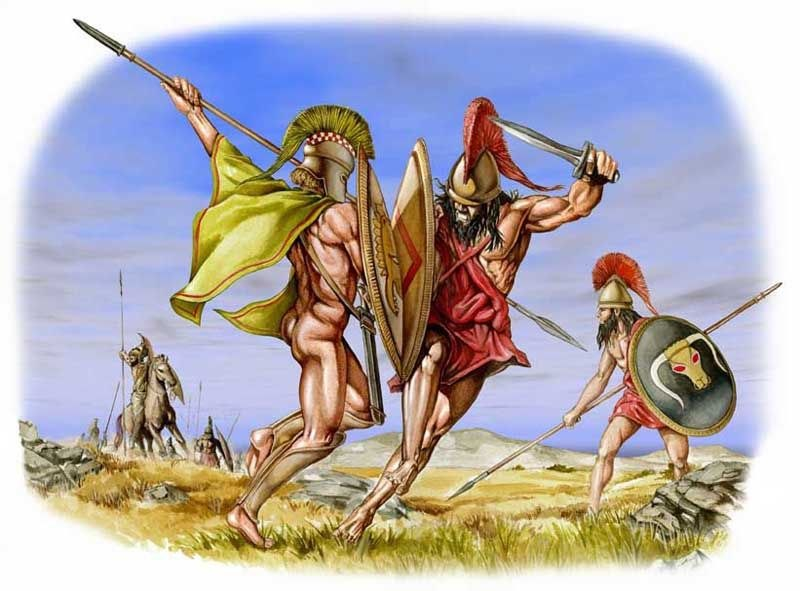 Классическое греческое искусство (вазопись, скульптура) часто изображало героев, богов и атлетов обнажёнными или полуобнажёнными. Обнажённость (гимнос) была идеалом, символом героизма, физического совершенства, доблести и «прекрасной смерти» (калос танатос). На вазах и фресках воины могут быть показаны с щитами и шлемами, но с обнажённым торсом или полностью обнажёнными. Это художественная условность, подчёркивающая их статус и идеальную форму, а не реалистичное изображение поля боя. Атлетика и агоги (спартанское воспитание): В Спарте и других полисах юноши тренировались обнажёнными (отсюда слово «гимнастика» — от gymnos, «голый»). Это создавало ассоциацию между обнажённым тренированным телом и воинской подготовкой. Однако на войну они шли одетыми. Лингвистическая путаница: Греческое слово gymnetes (γυμνῆτες) действительно означает «голые» или «легковооружённые». Но так называли не гоплитов, а беднейших воинов, которые не могли позволить себе доспехи и сражались как лёгкая пехота (с пр