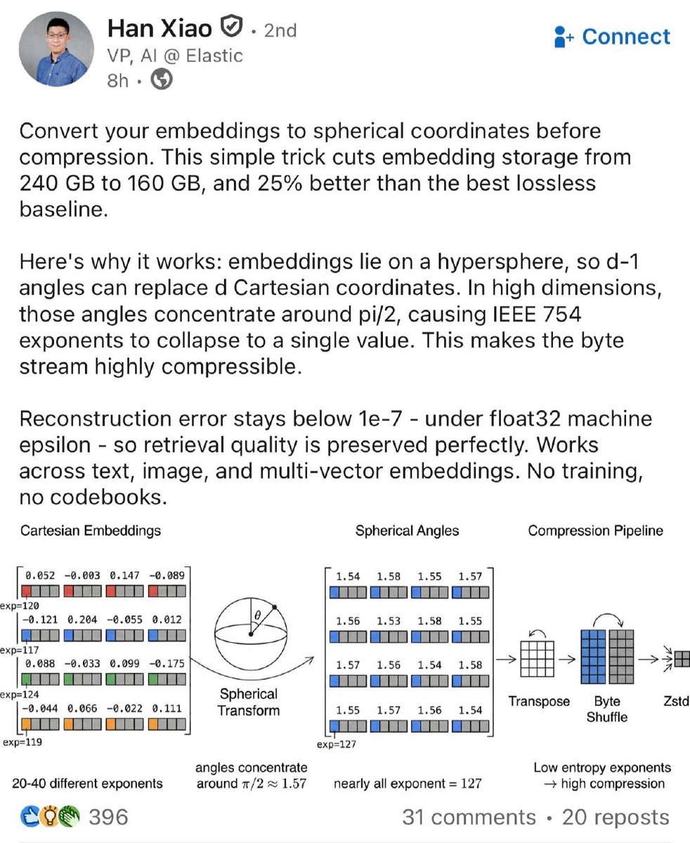 Han Xiao, VP AI в Elastic, сообщил, что перевод декартовых координат эмбеддингов в сферические позволяет уменьшить объём памяти для хранения с 240 ГБ до 160 ГБ. Погрешность восстановления при этом составляет 1e-7. Метод не требует обучения и кодбуков, подходит для текстовых, визуальных и мультивекторных эмбеддингов. https://dzen.ru/id/5c0e38ff46ef5c00aaa80527
