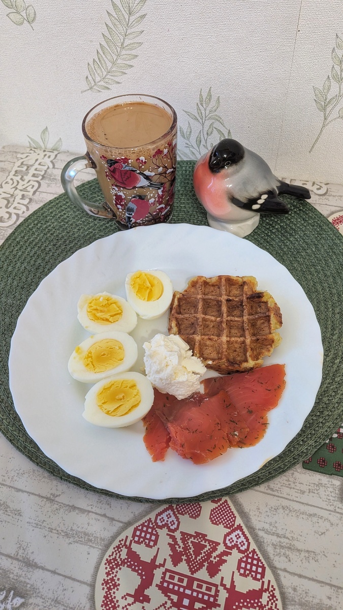 Завтрак: два вареных яйца, вафля из картофеля с творогом, кета холодного копчения, творожный сыр, кофе с молоком. 401 ккал.