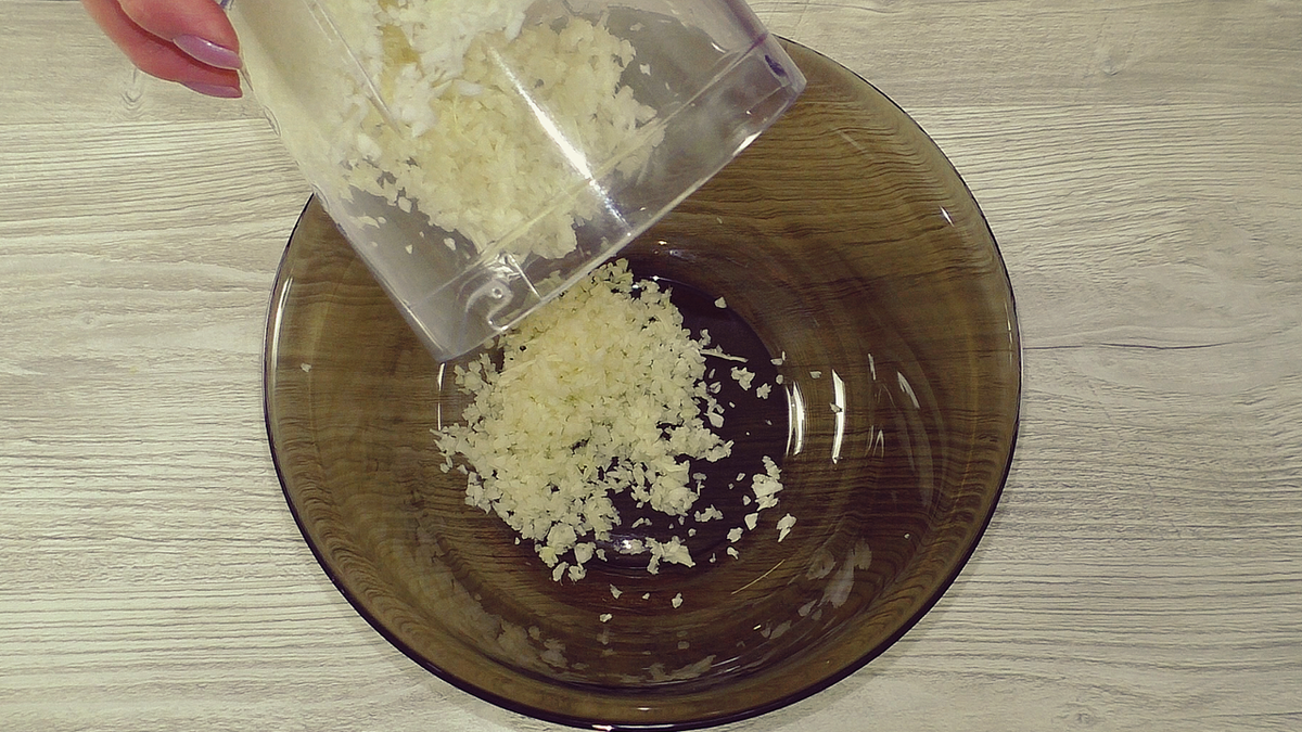 Измельчаем лук и добавляем в общую миску.