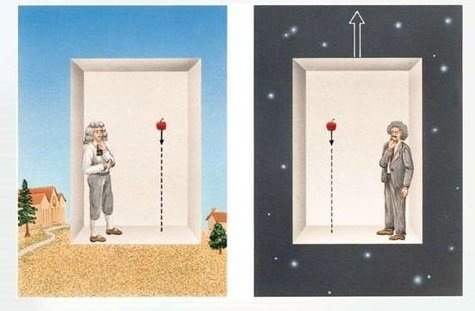 Повторю, образ свободно падающего с крыши дома человека и теряющего при этом свой вес – Эйнштейн когда-то назвал самой счастливой мыслью своей жизни. Если падающий человек выпустит из своих рук какой-нибудь предмет, то предмет, падая с таким же ускорением, будет покоиться относительно человека. В спутнике, на орбите Земли, то и происходит, все тела там находятся в невесомости, потому что «падают» на Землю с одним и тем же ускорением, но из-за первой космической скорости – промахиваются. Моя генеральная мысль проста: эквивалентность инерционного и гравитационного веса (массы) тела в том, что эти тела находятся постоянно под действием силы, природа которой тождественна, подобна. Здесь надо чётко различать массу и вес тела! Вес тела – это масса тела, умноженная на силу, действующую на тело, и вес тела измеряется в ньютонах. Вес тела – векторная величина, не является постоянной величиной, может меняться в зависимости от прилагаемой к телу силы. Тогда как масса – скалярная величина, не меняется.