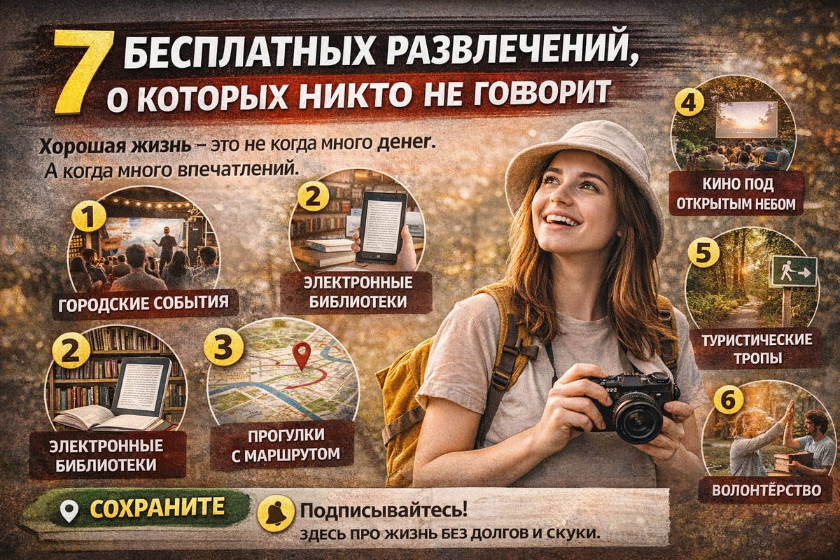 А когда много впечатлений. Выставки, лекции, фестивали — 90% бесплатные. Тысячи книг бесплатно. Обычная прогулка + цель = мини-путешествие. Летом — почти в каждом городе. Даже рядом с домом. От языков до инвестиций. Вы отдыхаете, помогая. 👉 Сохраните — пригодится.