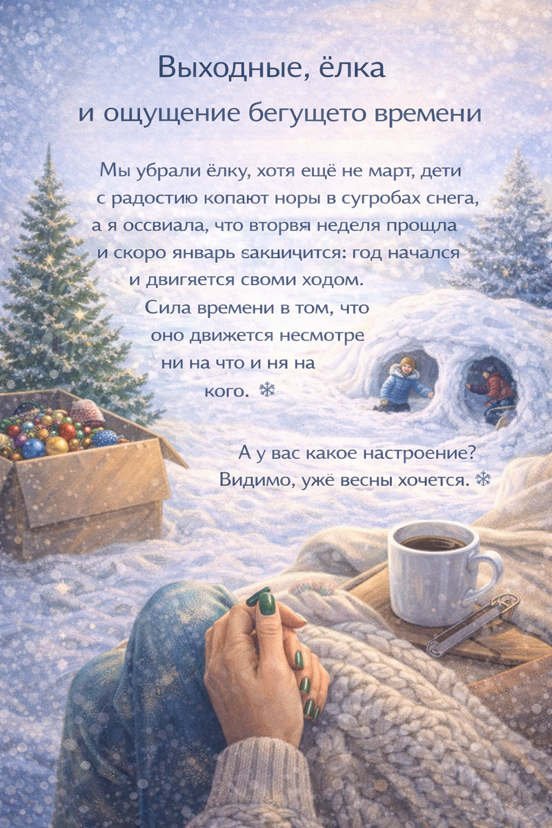 Эти выходные у нас прошли под знаком простых, но очень показательных решений. Мы убрали ёлку. Да, ещё далеко не март, но внутренне стало понятно — её время в этом году закончилось. Праздники окончательно отпустили, и дом словно выдохнул вместе с нами. Дети, конечно, живут в своём измерении времени. Пока взрослые считают недели и сроки, они с радостью копают настоящие норы в сугробах. Снега в этом году хватило с лихвой, и для них он всё ещё источник радости, приключений и бесконечной фантазии. Смотреть на это — отдельное удовольствие и напоминание о том, что момент «здесь и сейчас» тоже имеет ценность. А у меня в голове в какой-то момент щёлкнуло: вторая рабочая неделя уже прошла. Совсем скоро январь закончится. Год начался и уверенно движется своим ходом, без пауз и оглядок. И в этом есть своя сила. Наверное, главная особенность времени в том, что оно движется несмотря ни на что и ни на кого.