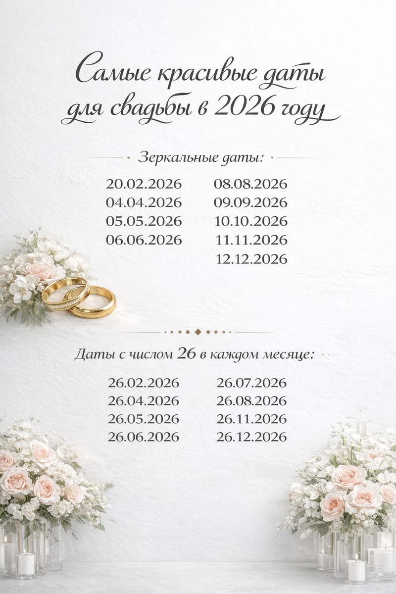 Планируете самое важное торжество в жизни и хотите, чтобы дата была элегантным символом? Представляем вашему вниманию самые эстетичные и популярные даты 2026 года. Сохраняйте этот гид, чтобы выбрать идеальный день для вашего торжества❤️ Зеркальные даты: 20.02.2026 04.04.2026 05.05.2026 06.06.2026 07.07.2026 08.08.2026 09.09.2026 10.10.2026 11.11.2026 12.12.2026 Отдельная поэзия — даты с числом 26 в каждом месяце. В 2026 году они приобретают особый, «фирменный» шарм, будто созданы специально для вашей истории. 26.02.2026 26.04.2026 26.05.2026 20.06.2026 26.07.2026 26.08.2026 26.09.2026 26.11.2026 26.12.2026 Понравившуюся дату стоит бронировать в Дворце бракосочетаний и у ведущих заранее — на такие красивые числа всегда высокий спрос! ☺️