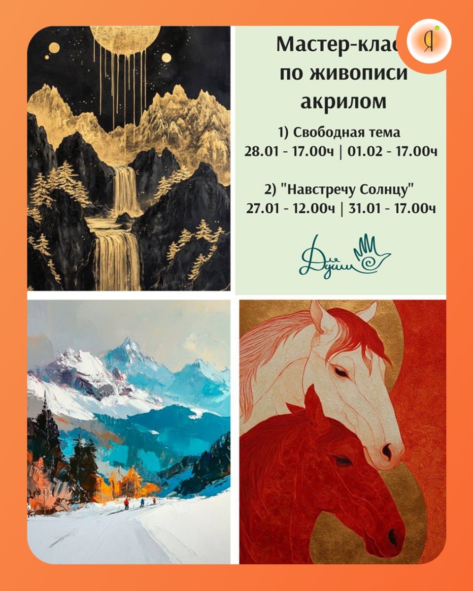 #МК МК «Навстречу Солнцу» (с использованием золотой краски или потали) 27 января | 12:00 31 января | 17:00 МК на свободную тему: 28 января | 17:00 1 февраля | 17:00 Продолжительность 1,5-3часа Свердлова 10а, 2 этаж 1200 руб. По предварительной записи: +79241731117 Online Якутия | Ждем вас в МАХ
