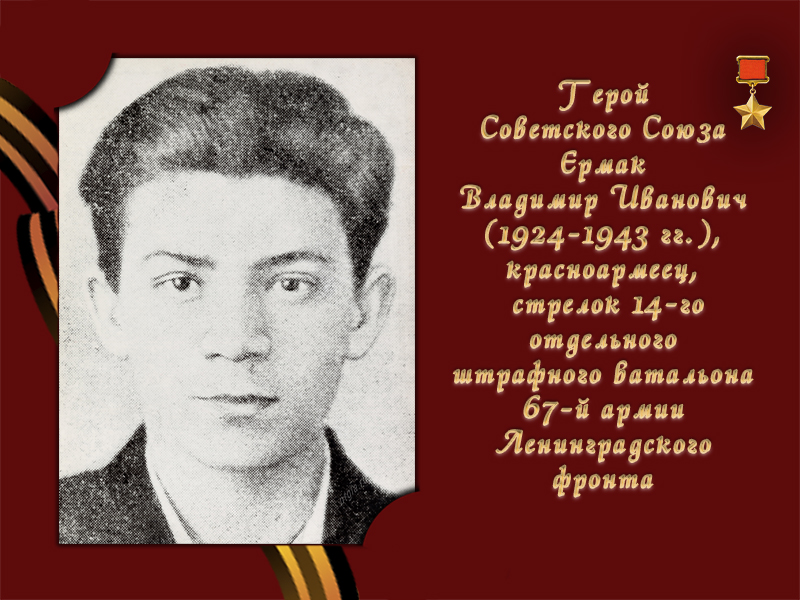 Владимир Иванович Ермак (15 мая 1924 - 19 июля 1943) - единственный в истории СССР боец-штрафник, который получил звание Героя Советского Союза посмертно. Его подвиг стал символом мужества и самопожертвования во время Великой Отечественной войны. Ермак родился в Бобруйске в семье военнослужащего. После развода родителей переехал с матерью в Ленинград, где окончил 9 классов школы. С началом войны, будучи несовершеннолетним, не был призван в армию, но добровольно вступил в комсомольский противопожарный полк. Участвовал в тушении пожаров после бомбёжек и артобстрелов блокадного Ленинграда. В начале 1942 года вместе с матерью эвакуировался в Нижний Тагил, где до августа 1942 года работал слесарем на заводе. В августе 1942 года был призван в Красную Армию, в октябре 1942 года зачислен курсантом Смоленского артиллерийского училища. В марте 1943 года получил звание лейтенанта и был направлен в распоряжение командующего артиллерией Ленинградского фронта. В июне 1943 года назначен командиром в