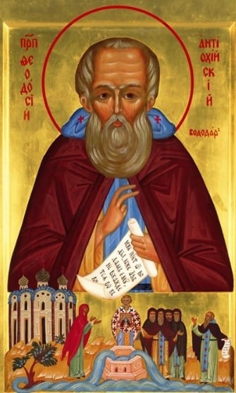 Преподобный Феодосий жил в IV веке, происходил из знатного антиохийского рода, но с юных лет оставил мир и вступил на тесный и скорбный путь христианского подвига, поселившись в малой келлии на берегу Исского залива, в окрестностях города Росс. Свое тело святой утруждал поклонами и лежанием на голой земле, носил власяницу и тяжелые железные вериги, сам обеспечивал себя всем необходимым и помогал приходящим к нему. Некоторые просили разрешить остаться с ним, чтобы вести такую же подвижническую жизнь. Так вокруг кельи возник монастырь. Феодосий поддерживал иноков своим примером и наставлениями, а также силой чудес. Однажды он, как Моисей, ударил посохом по обрывистой скале, нависшей над монастырем, и из скалы забил источник. Высокая жизнь святого была известна и далеко за пределами монастыря. Его знали и христиане, и язычники. Случалось, что от одного имени преподобного Феодосия укрощались морские волны. Его боялись и чтили разбойники и просили его молитв. Уходя от людской славы, свят
