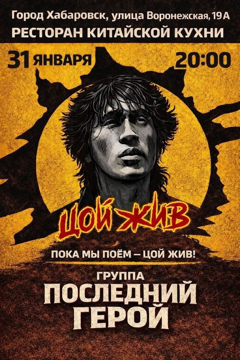 » ✔ Живой звук ✔ В программе нетленные хиты В. Цоя ✔ Прозвучат «Кукушка», «Звезда по имени солнце», «Группа крови» и другие ✔ Исполнение группы «Последний герой» (г. Находка) 📅 Когда: #31_января, 20:00 ⛳ Где: «Пять Звезд», ул. Воронежская, 19А 💳 Стоимость: 500 ₽ 📞 Контакты: +7 (914) 314-14-59 Билеты 👉 Афиша Хабаровска. Куда сходить, экскурсии
