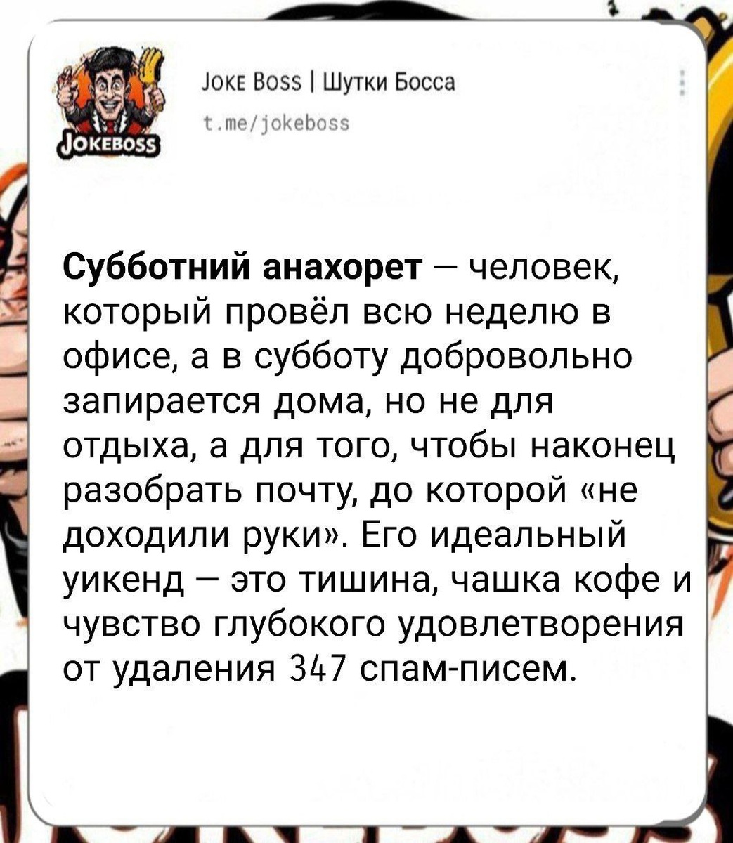 Его счастье — не в поездках на природу, а в чистом рабочем столе на компьютере и пустом почтовом ящике. Это высшая форма аскезы в мире корпоративного шума. #СубботнийАнахорет #ЦифровоеЗатворничество #УикендДляПочты #АскезаВОпросах #суббота #юмор #шутки #joke #jokeboss #шуткибосса