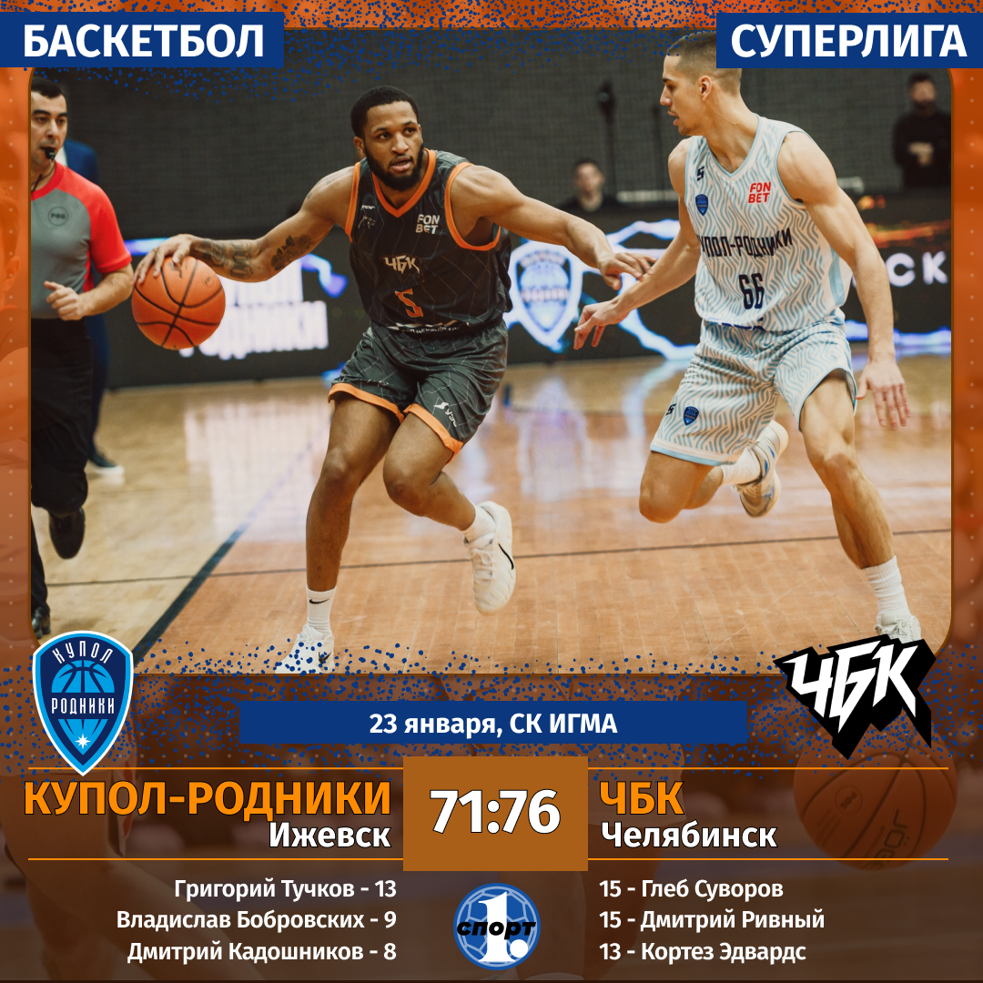 Челябинский баскетбольный клуб прервал серию из трех поражений кряду в Суперлиге, выиграв в гостях у ижевской команды «Купол-Родники» со счетом 76:71. В равном поединке игроки «ЧБК» здорово сыграли в концовке, а героем матча стал американец Кортез Эдвардс. Эта победа помогла челябинской команде сохранить лидерство в чемпионате, сообщает корреспондент ИА «Первое областное». Челябинцы хорошо начали поединок, повели в счете 8:5 после 5 минут игры. Причем, у хозяев очки набирал лишь Владислав Бобровских. У нашей команды роль лидера взял на себя Глеб Суворов. В его активе также были 5 очков, при этом игрок показал 100%-ную реализацию бросков. 22:17 с таким счетом в пользу челябинцев завершился первый отрезок матча. Вела в счете команда «ЧБК» после второй и третьей четверти поединка. В четвертом периоде хозяева площадки вплотную приблизились к сопернику, а за три минуты до конца матча и вовсе вышли вперед — 71:69. В ответственный момент здорово сыграл американский легионер «ЧБК» Кортез Эдвар