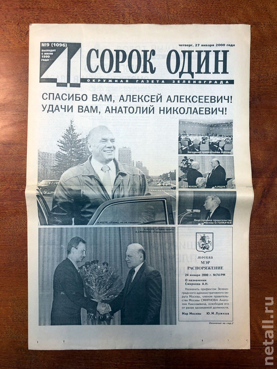 58-летний Алексей Ищук, возглавлявший администрацию Зеленограда в течение 12 лет, уступил кресло своему первому заместителю 45-летнему Анатолию Смирнову, который продолжает руководить городом по сей день. Уже через две недели, 8 февраля 2000 года, новый префект Анатолий Смирнов встречал в Зеленограде правительственную делегацию во главе с исполняющим обязанности президента России Владимиром Путиным, который посетил МИЭТ, где принял участие в открытии Зеленоградского инновационно-технологического центра, и побывал на заводе «Ангстрем». Вскоре в газете «Сорок один» вышло первое большое интервью Анатолия Смирнова подписаться / обсудить в чате