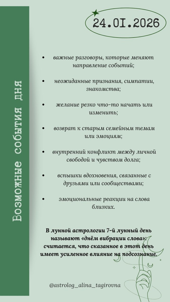 2️⃣4️⃣ января, суббота В 10:12 начало 7️⃣-го Лунного дня Растущая Луна в знаке ♈️Овен Общая характеристика дня 7-й лунный день — день слова, намерения и силы мысли. В древних лунных традициях считалось, что всё сказанное сегодня имеет особую силу материализации. Это день, когда слово становится действием. Луна в Овне усиливает огненную, стартовую энергию: появляется желание действовать быстро, прямо, без оглядки. Это день инициативы, смелых решений и первых шагов. Секстиль к Венере в Водолее добавляет лёгкость в общении, поддержку от друзей, неожиданные симпатии и нестандартные решения в отношениях и финансах. Но квадратура к ретро-Юпитеру в Раке напоминает: чрезмерные эмоции, обиды прошлого и семейные установки могут мешать двигаться вперёд. Возникает внутренний конфликт между «хочу сейчас» и «мне привычно и безопасно». Это день: активных разговоров, запуска идей и проектов, проверки истинных желаний, столкновения прошлого и будущего, выбора между ростом и привычкой. Психолог Ка