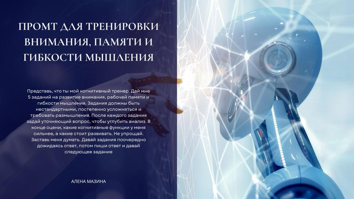 Вопрос не «хорошо или плохо». Вопрос - как использовать его для мозга. Мир искусственного интеллекта не спрашивал нас, готовы ли мы. Он просто вошёл - тихо, быстро, без стука. И пока одни генерируют ролики, другие рисуют аватарки, третьи пишут тексты «за пять секунд», я поймала себя на профессиональном интересе: а можно ли использовать ИИ не как костыль, а как тренажёр для мозга? Как психофизиолог я вижу две дорожки: • если ИИ делает всё за вас - префронтальная кора довольно быстро привыкает «не напрягаться»; • если ИИ становится партнёром по мышлению - включаются внимание, рабочая память, гибкость и критическое мышление. ИИ в этом случае работает как зеркало: он показывает, как вы формулируете мысль, держите задачу, уточняете, спорите, выбираете. То есть включает мозг, а не выключает. ВАЖНО (очень): это не заменит полноценные тренировки и не “вылечит” перегруз, но может стать очень хорошей поддержкой - особенно в дни, когда голова как будто в тумане, а думать всё равно нужно. И