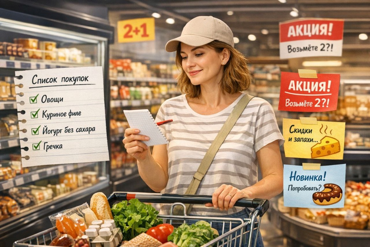 Не потому что «вы слабые», а потому что магазин всё делает за вас: — запахи — акции «возьми 2» — красивая упаковка — и голод, который пришёл внезапно и без приглашения И вот вы уже вышли с пакетом, где: ✔️ вроде бы «нормальная еда» ❌ но калорийность и жирность — как у праздничного стола И самое интересное — вы этого не планировали. Список покупок — это не про контроль. Это про снижение когнитивной нагрузки. Когда списка нет, мозг работает так: «О, это знакомо — беру» «О, акция — надо брать» «Ну раз уж здесь…» Когда список есть: — вы меньше реагируете на маркетинг — вы реже берёте лишнее — вы не приходите домой с ощущением «я опять что-то не то купила» Но! ⚠️ Список тоже может быть ловушкой, если он составлен «на автомате». Небанальный момент, о котором мало говорят Большинство людей покупают не продукты, а привычки. Они берут: — не «сыр», а тот самый, который всегда — не «йогурт», а проверенный бренд — не «что полезно», а что не требует думать И вот тут начинается самое интересно