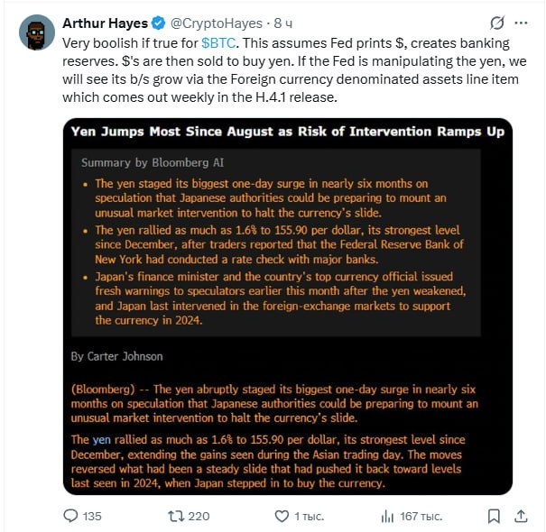 🔸Артур Хейз думает, что резкий рост иены может быть «очень бычьим» сигналом для биткоина, если он отражает приток ликвидности со стороны ФРС и валютные интервенции, которые проявятся в предстоящих данных по балансу.